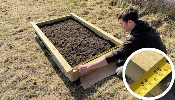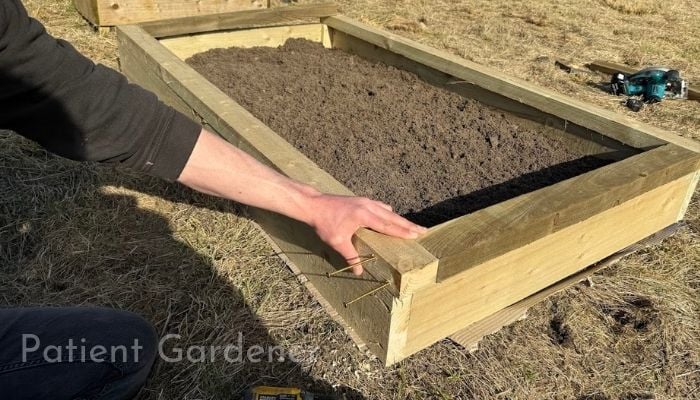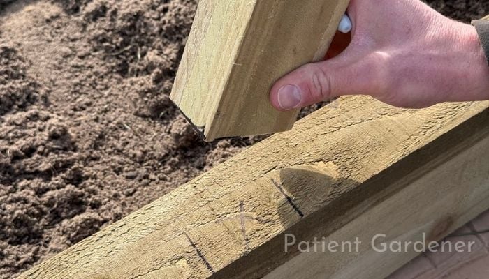 Measure the length of your raised bed and cut two pieces of timber to the same length.