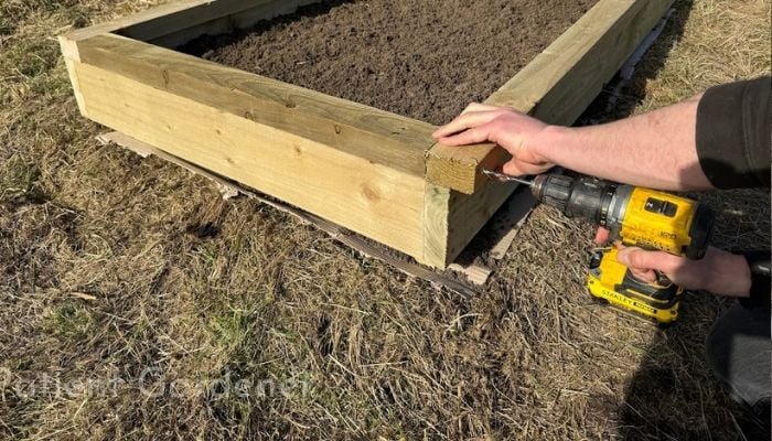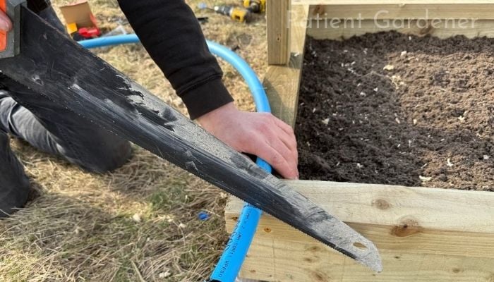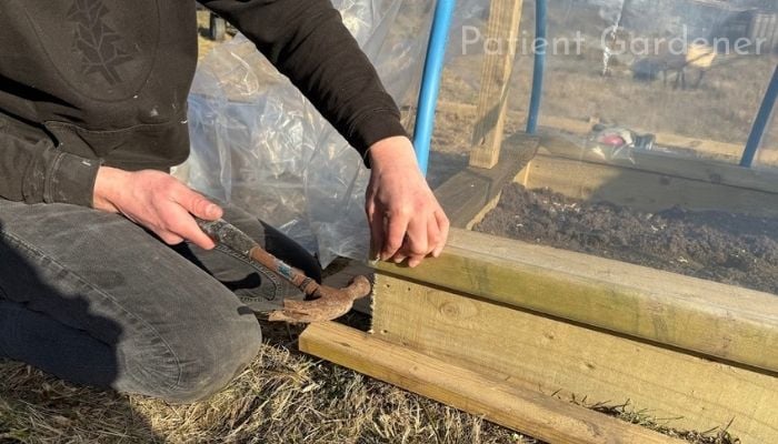 Sam installed this bed on top of an existing raised bed (build guide for that coming soon). If you are putting yours on an existing bed, then make sure the wood is thick enough to support the hinges and weight of this hoop house.