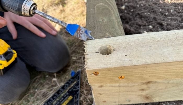 Only drill half way through your 3x2 frame with your spade bit. Use some tape to mark half the depth of the 3"x2" on the drill bit. You can see Sams blue tape in the photo above.