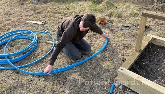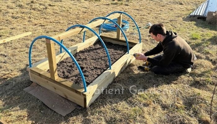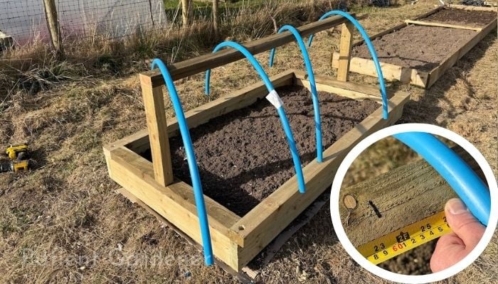 Hold the alkathine pipe at one end of the hoop house and bend it roughly into the correct position. Mark the pipe 1" longer with a marker pen as you can always trim this down later!