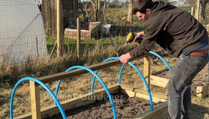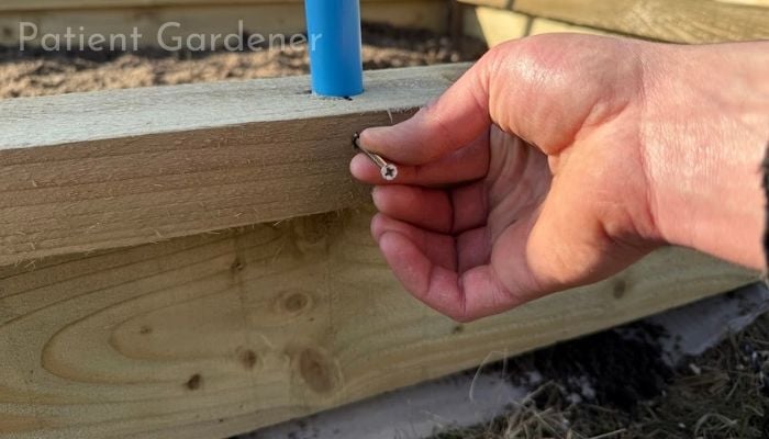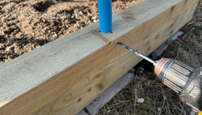 Drill a 3/16" (4mm) pilot hole through the side of the hoop house frame ½" (12mm) down from the top edge. Only pilot drill through the timber, and not into the plastic pipe!