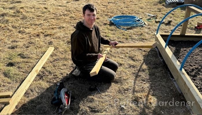 Cut two upright timbers to half the width of the planter, not the hoop house frame!